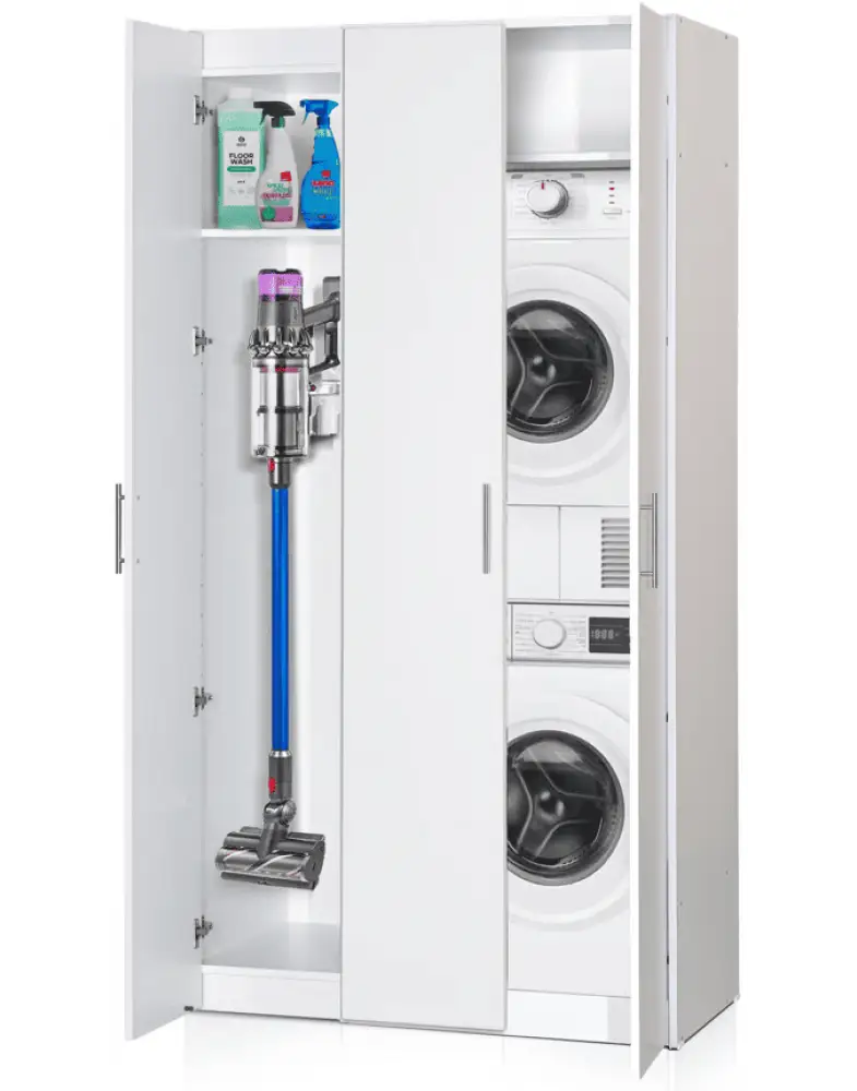 הארון מציע מקום ייעודי למכונת כביסה ומייבש בעיצוב אנכי, זה מעל זה.