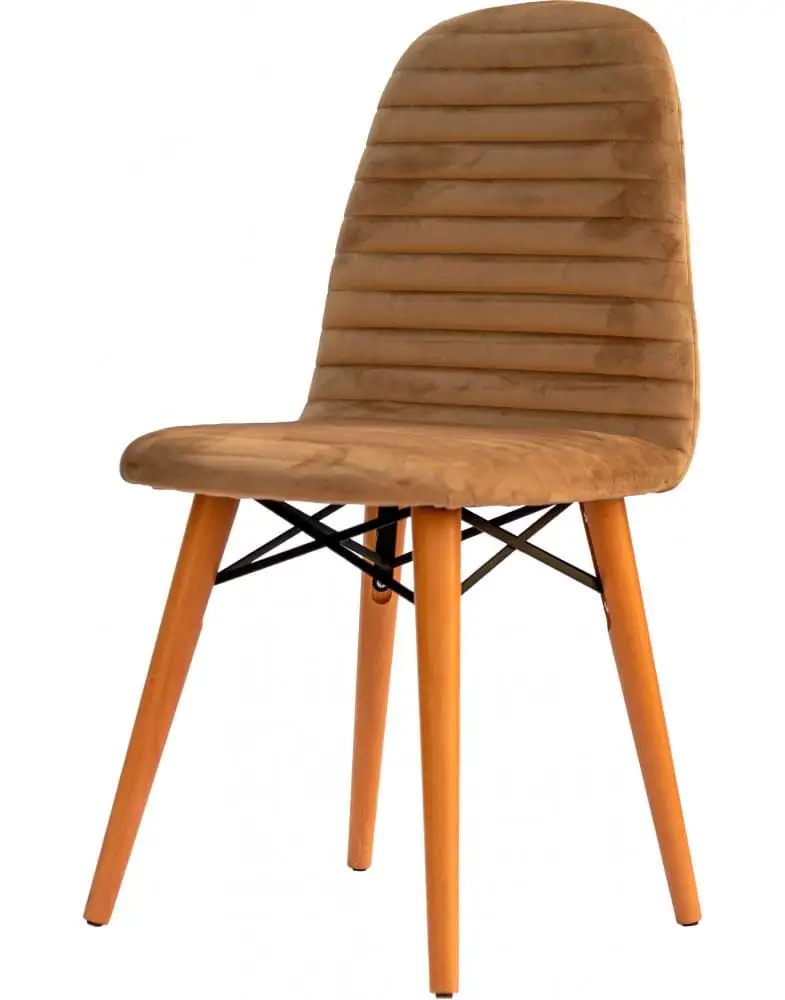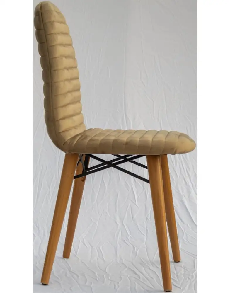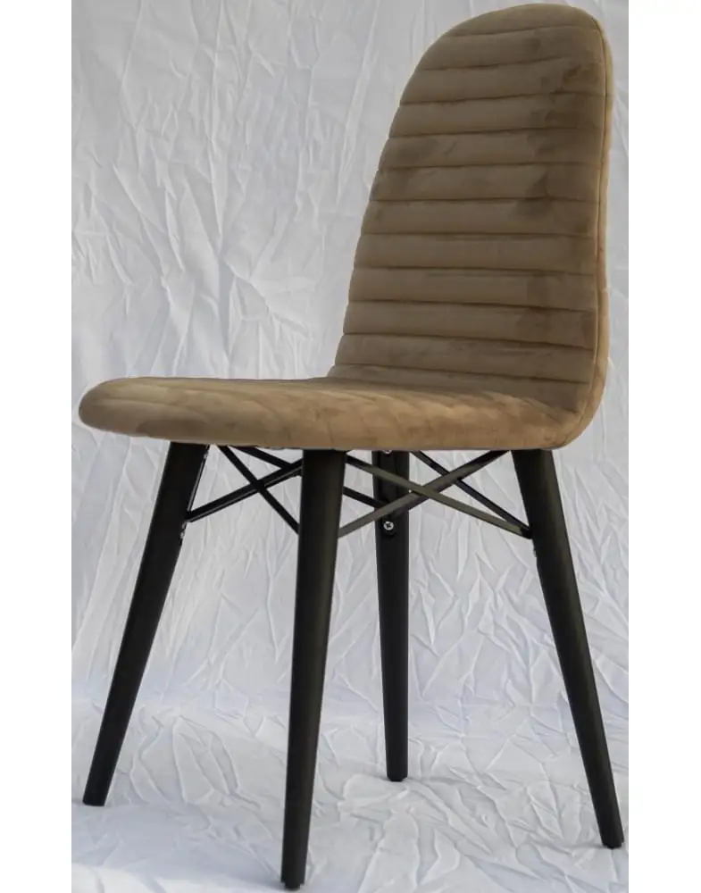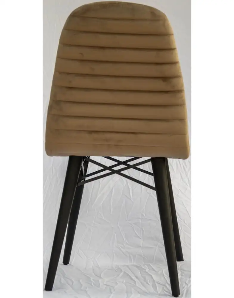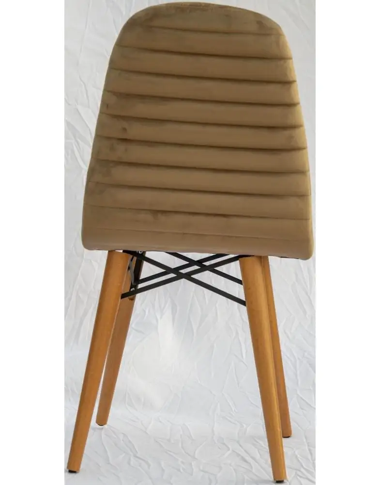 הכיסא מציג עיצוב קווילט (תפירת פסים אופקיים),ייחודי ואלגנטי על גב המושב, המרופד בבד קטיפתי רך ונעים בגוון חום-בז’ עשיר.